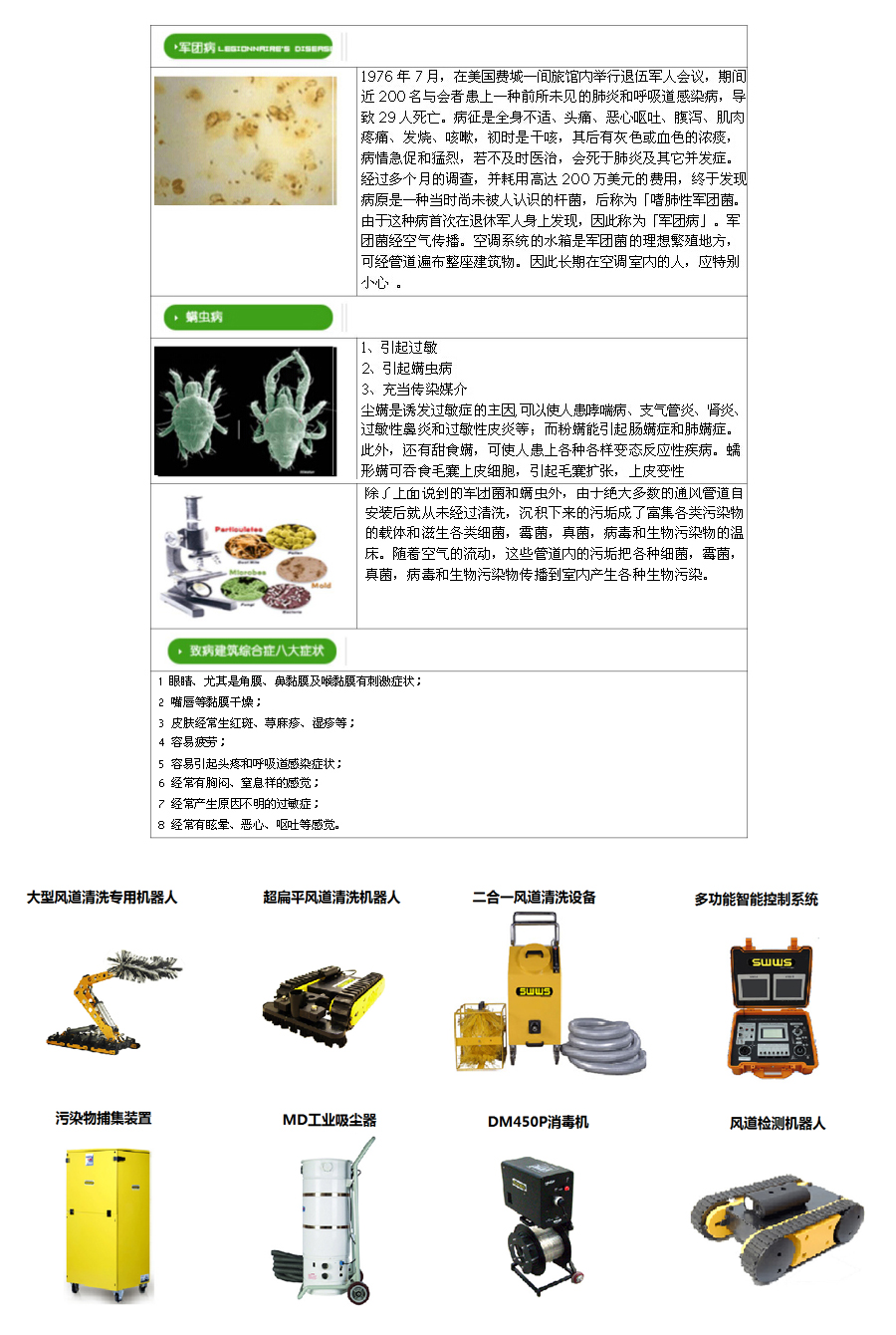 如今空調(diào)已經(jīng)成為許多大型建筑不可或缺的一部分,然而,在給人們帶來舒適室內(nèi)環(huán)境,由于長期得不到清洗維護(hù),空調(diào)系統(tǒng)成為病菌滋生的溫床,尤其風(fēng)管內(nèi)一年四季溫濕度較為適宜動物和昆蟲寄生,如老鼠、蟑螂等。長期得不到清洗維護(hù)的空調(diào)通風(fēng)系統(tǒng)成為病菌滋生的溫床,生活在被污染的空氣中,輕則引發(fā)惡心、干咳、皮膚過敏、人體疲勞,重則可能引發(fā)呼吸道傳染病,如軍團(tuán)病、SARS 病毒等;同時風(fēng)管中大量堆積灰塵垃圾,會導(dǎo)致風(fēng)阻加大、機(jī)組運(yùn)轉(zhuǎn)能力下降,增加了能源損耗,設(shè)備使用壽命也會受到影響。 隨著非典的影響,越來越多的人意識到空調(diào)風(fēng)管是傳播的重要途徑,健康意識有所加強(qiáng),對風(fēng)管清洗的認(rèn)識大大提高,市場需求逐漸啟動。在國內(nèi)由于缺乏專業(yè)的空調(diào)風(fēng)管清洗技術(shù)和設(shè)備,大多數(shù)地區(qū)的空調(diào)長期運(yùn)行卻沒清洗過。